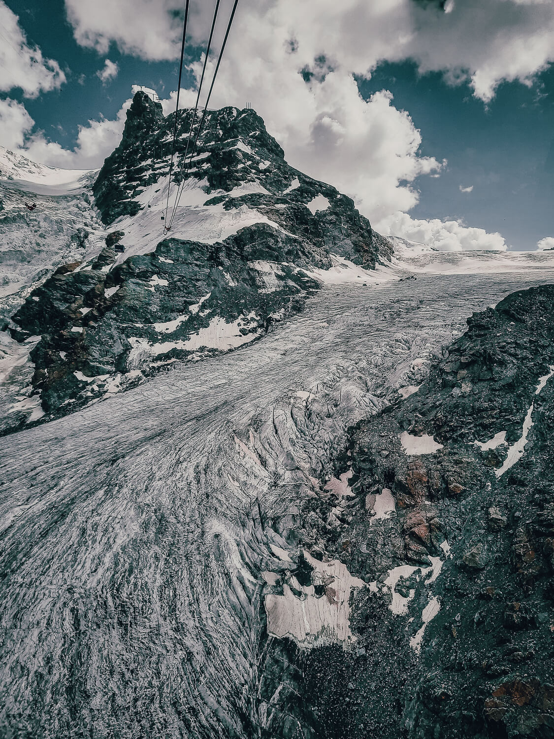 De gondel bracht ons rustig over de Theodulgletsjer, steeds verder omhoog, tot we een duizelingwekkende 3820 meter hoogte bereikten. Voor mij een persoonlijk record – het hoogste punt waar ik ooit eerder was, was in het Peruaanse dorp Cuzco, op 3.399 meter.